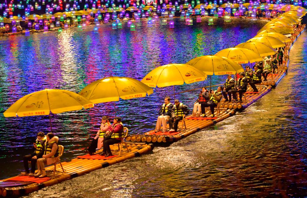 烤活魚一條街旁的河道里,花船載歌載舞,首尾相連的竹筏宛若游龍在河道中蜿蜒前行?!褒堄呜曀碧厣^光項(xiàng)目吸引了不少游客佇立岸邊“看稀奇”。