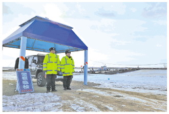 1月下旬正午時(shí)分,嫩江邊氣溫接近零下20℃,《法治日?qǐng)?bào)》記者身上厚重的冬裝幾分鐘就被江邊的寒風(fēng)吹透。一座簡(jiǎn)易浮橋橋頭遮陽(yáng)棚旁停著一輛噴有“油田特警”字樣的警車,黑龍江省大慶市公安局油田分局的特警隊(duì)員正巡查著出市車輛,截?cái)啻髴c被盜原油外運(yùn)通道,這是油田公安分局護(hù)衛(wèi)石油安全的重要一環(huán)。