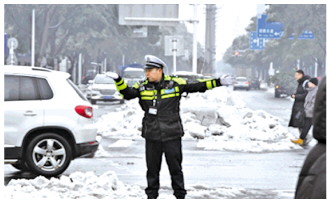 從早上7點(diǎn)至晚上11點(diǎn),忙碌在風(fēng)雪保暢的交通管理一線,他嘶啞的嗓音、疲憊的眼神、有力的手勢(shì)、奔跑的腳步、溫暖的交談……