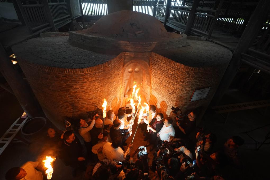 2023年10月19日,嘉賓與把樁師傅一起對葫蘆窯進(jìn)行復(fù)燒點(diǎn)火。當(dāng)日,作為2023中國景德鎮(zhèn)國際陶瓷博覽會的活動之一,景德鎮(zhèn)古窯民俗博覽區(qū)對重建的明代葫蘆窯進(jìn)行點(diǎn)火復(fù)燒。同時(shí),景德鎮(zhèn)歷代瓷窯活態(tài)傳承紀(jì)實(shí)館開館。新華社記者 周密 攝