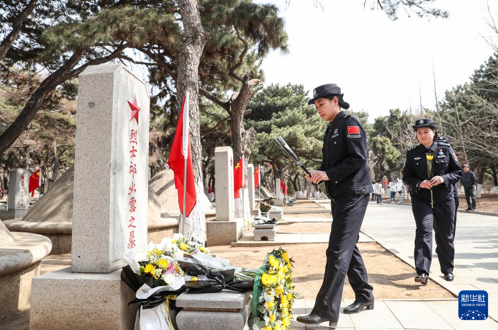 4月2日,在沈陽(yáng)抗美援朝烈士陵園,沈陽(yáng)出入境邊防檢查站民警在烈士墓碑前獻(xiàn)花。