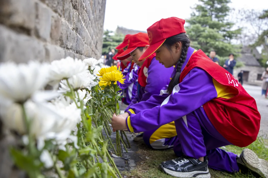 在山東棗莊臺兒莊古城,當(dāng)?shù)貙W(xué)生參加鮮花祭奠活動。(受訪單位供圖)