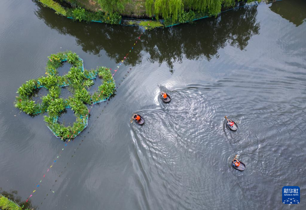 5月25日,村民們參加水鄉(xiāng)劃菱桶比賽。菱桶是河網(wǎng)密布的東林鎮(zhèn)百姓家中常見(jiàn)的一種傳統(tǒng)水上勞動(dòng)工具,村民在捕魚(yú)、采菱、采荷時(shí)都要用到(無(wú)人機(jī)照片)。
