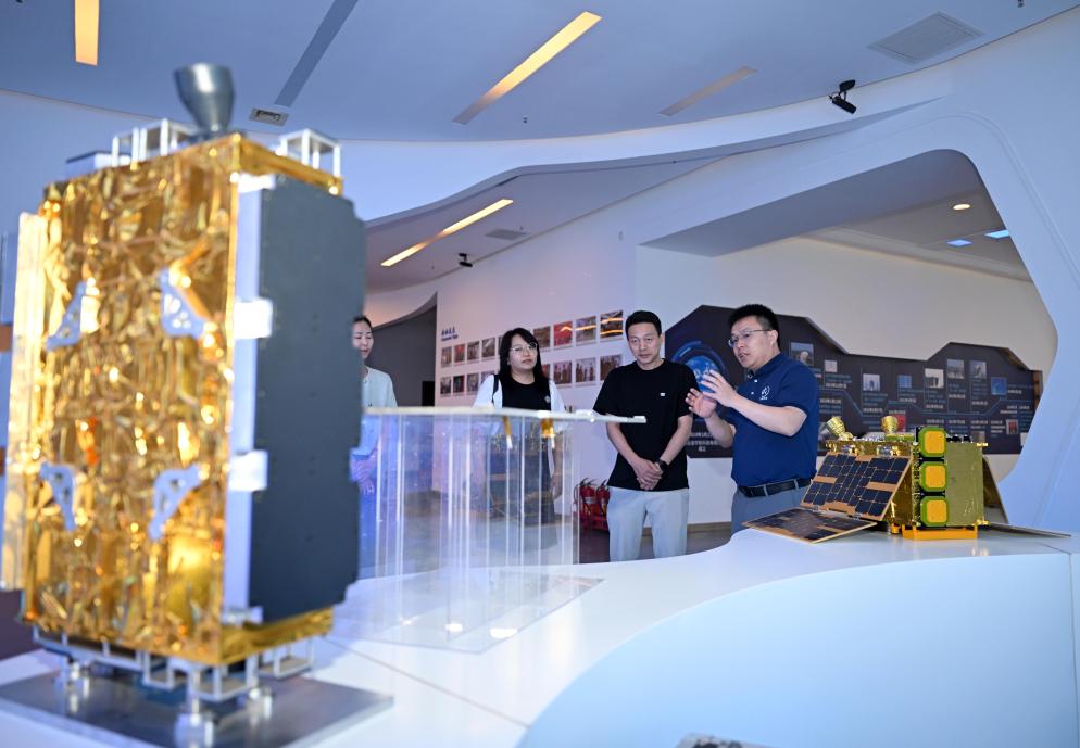 在云遙宇航的展廳內(nèi),李峰輝(右)向前來參觀的客戶介紹公司衛(wèi)星產(chǎn)品(6月4日攝)。