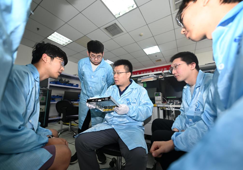 在云遙宇航的研發(fā)部,李峰輝和團(tuán)隊(duì)成員討論一款衛(wèi)星核心部件的集成電路板(6月4日攝)。