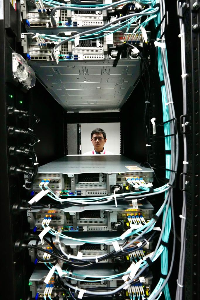 2月27日,克拉瑪依云計(jì)算產(chǎn)業(yè)園區(qū)華為云服務(wù)數(shù)據(jù)中心,技術(shù)人員正在巡查。新華社發(fā)(崔文娟 攝)