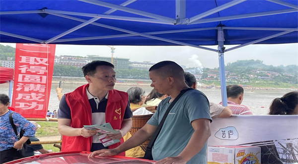 工作人員向看龍舟比賽的群眾宣傳法律法規(guī)