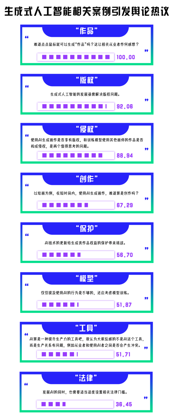 與生成式人工智能有關(guān)的案件一經(jīng)宣判,便引發(fā)了輿論廣泛關(guān)注,“作品”“版權(quán)”“模型”“工具”“法律”等詞語頻繁被提及,成為公眾討論的焦點。