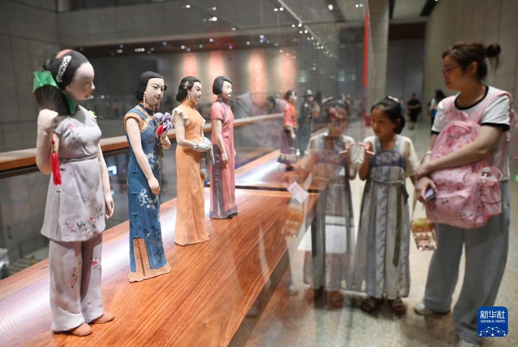 8月7日,中國(guó)工藝美術(shù)館展廳舉行的中華歷代服飾泥塑展吸引游客駐足觀看。