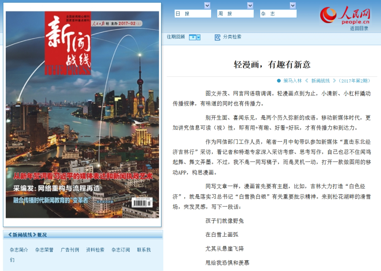 人民日?qǐng)?bào)社《新聞戰(zhàn)線》雜志2017年第2期刊發(fā)《輕漫畫,有趣有新意》。