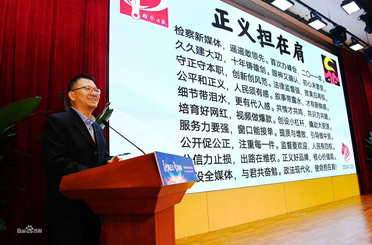 2024年1月23日,參加檢察新媒體創(chuàng)新發(fā)展研討會(huì)暨2023年度全國(guó)檢察新媒體精品展示活動(dòng),發(fā)言提出:我從2013年至今參加過6屆檢察日?qǐng)?bào)社新媒體活動(dòng),是資深粉絲,有深厚感情。檢察日?qǐng)?bào)社團(tuán)結(jié)檢察機(jī)關(guān)新媒體同仁秉承“強(qiáng)化法律監(jiān)督維護(hù)公平正義”宗旨,久久為功,十年鑄劍,成功打造了“正義”新媒體融媒體品牌,令人備感振奮、備受鼓舞。在新時(shí)代新征程上,希望“正義”新媒體融媒體守正創(chuàng)新,注重共情共鳴,集結(jié)社會(huì)力量,通過短視頻等新傳播方式,充分呈現(xiàn)法律監(jiān)督效果,講好政法故事,增強(qiáng)傳播力服務(wù)力監(jiān)督力公信力,讓人民群眾在每一個(gè)司法案件中感受到公平正義。《正義擔(dān)在肩》:檢察新媒體,遙遙敢領(lǐng)先。首次辦峰會(huì),二〇一一年。久久建大功,十年鑄利劍。眼神又確認(rèn),初心未曾變。守正守本職,創(chuàng)新創(chuàng)風(fēng)范。法律監(jiān)督強(qiáng),效果應(yīng)再現(xiàn)。公平和正義,人民須有感。敘事帶露水,才有新鮮感。細(xì)節(jié)帶淚水,更有代入感。共情才共鳴,共識(shí)方共建。培育好網(wǎng)紅,視頻做爆款。創(chuàng)設(shè)小杠桿,撬動(dòng)大資源。服務(wù)力要強(qiáng),窗口能接單。提質(zhì)與增效,引導(dǎo)做中堅(jiān)。公開促公正,注重每一件。監(jiān)督要?dú)g迎,人民有四權(quán)。公信力止損,出路在維權(quán)。正義好品牌,核心價(jià)值觀。建設(shè)全媒體,與君共奮勉。政法現(xiàn)代化,使命擔(dān)在肩。