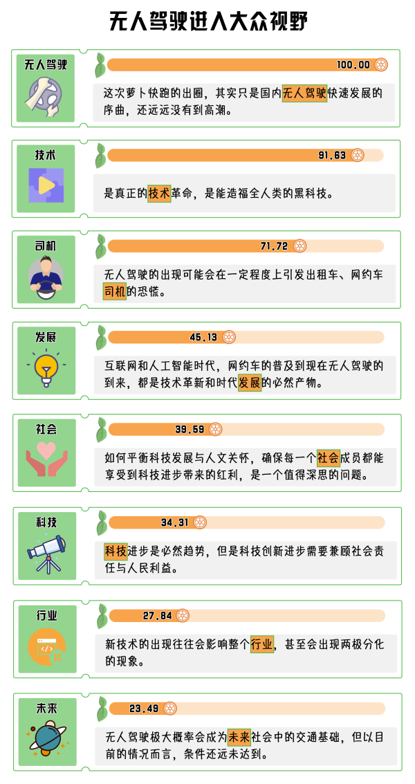 (制作:法治網(wǎng)輿情中心 數(shù)據(jù)來源:收集知乎問題“你怎么看百度無人駕駛蘿卜快跑”下的1300個(gè)回答,對(duì)選取的回答進(jìn)行數(shù)據(jù)清洗及自然語言處理,將熱度最高的詞語規(guī)定為100)