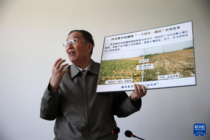 李振聲院士在介紹河北海興鹽堿地治理的前后對比照片(2014年5月5日攝)。 新華社記者金立旺攝