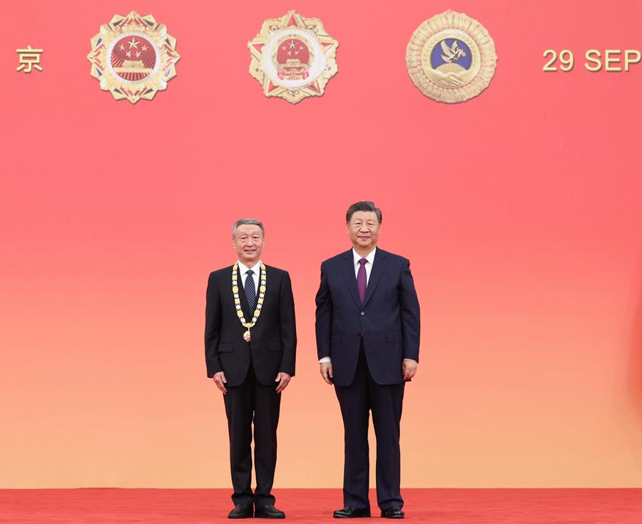 9月29日,中華人民共和國(guó)國(guó)家勛章和國(guó)家榮譽(yù)稱(chēng)號(hào)頒授儀式在北京人民大會(huì)堂金色大廳隆重舉行。中共中央總書(shū)記、國(guó)家主席、中央軍委主席習(xí)近平向“人民工匠”國(guó)家榮譽(yù)稱(chēng)號(hào)獲得者許振超頒授獎(jiǎng)?wù)隆?/p>