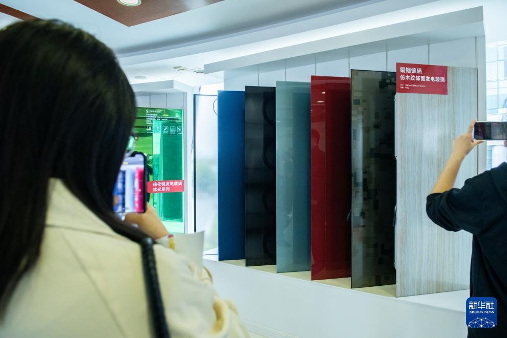 這是浮法玻璃新技術(shù)國家重點實驗室內(nèi)展出的銅銦鎵硒仿木紋飾面發(fā)電玻璃等研發(fā)產(chǎn)品(11月8日攝)。