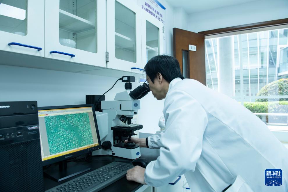 研究人員在浮法玻璃新技術(shù)國家重點實驗室內(nèi)利用顯微鏡觀察空心玻璃微珠(11月8日攝)。
