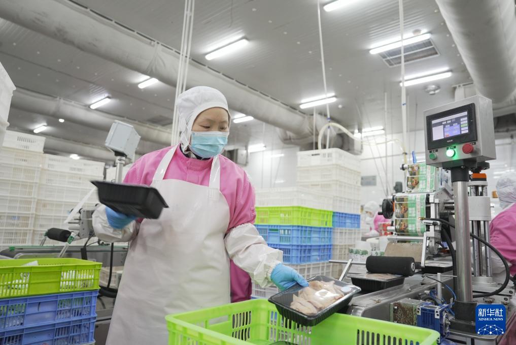 11月29日,在石門縣一家家禽加工企業(yè)冷鏈車間,工人在包裝雞肉。