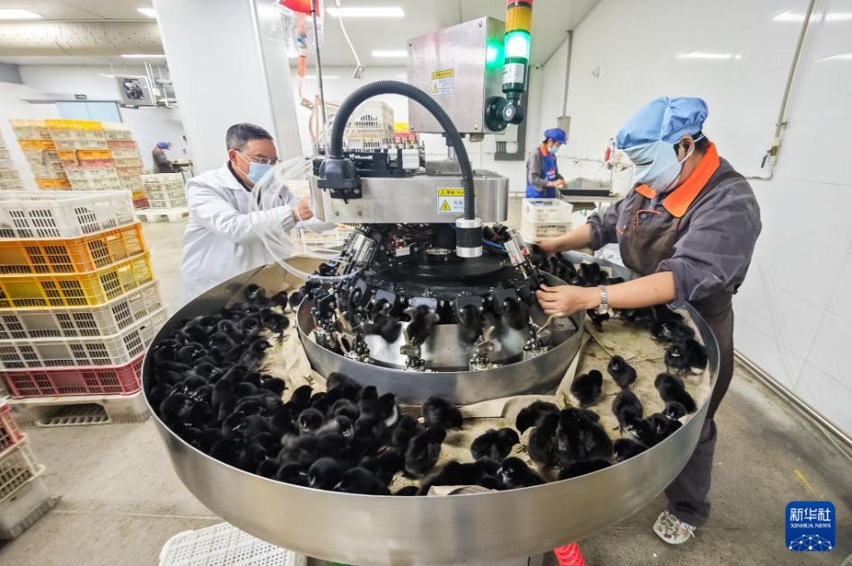 11月29日,在石門縣一家家禽加工企業(yè)雞苗處理車間,工作人員使用自動化設備給雛雞打疫苗。
