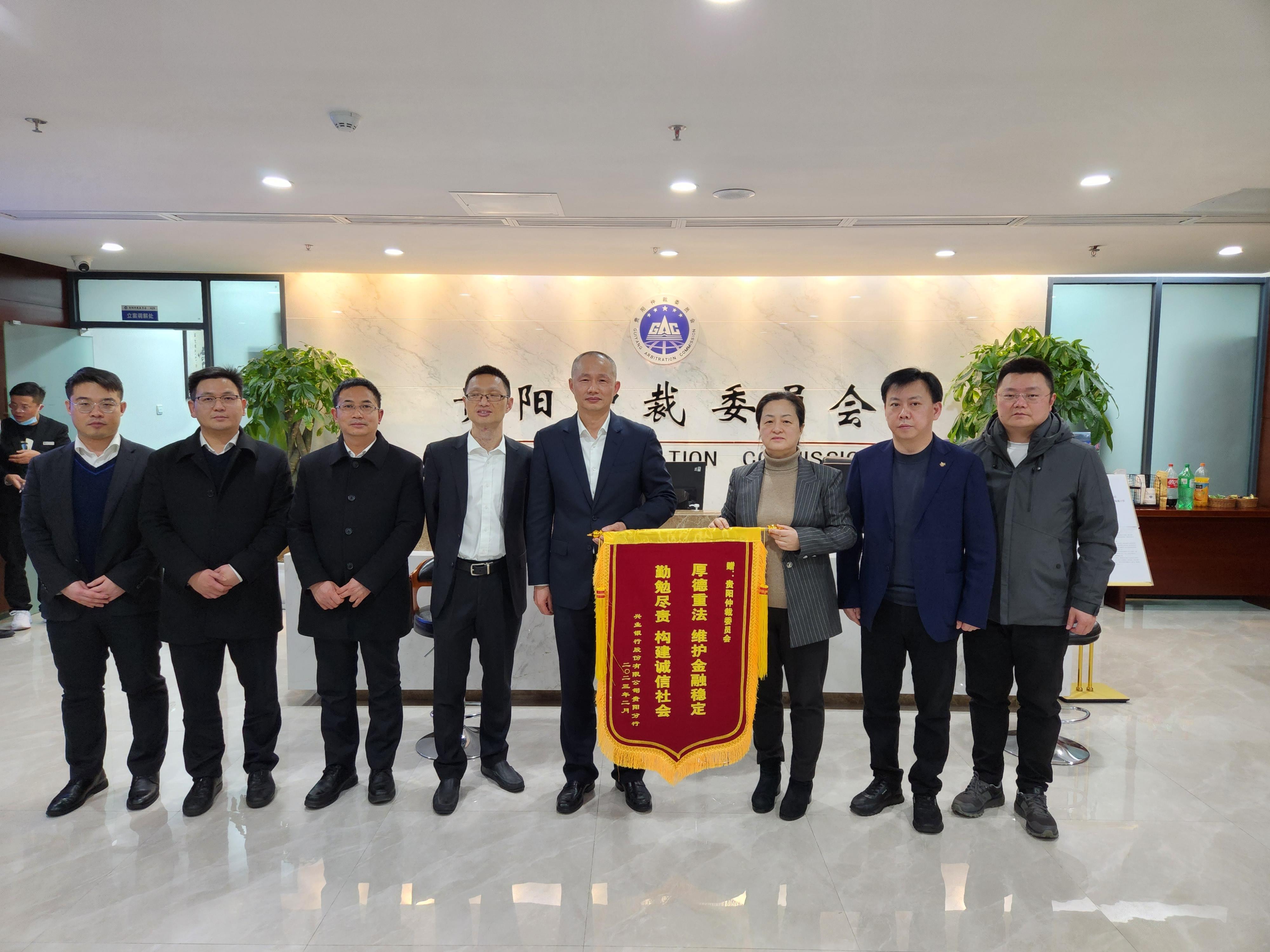 2023年2月23日,由于貴陽仲裁委員會在興業(yè)銀行貴陽分行設(shè)立信用卡仲裁調(diào)解中心以來協(xié)助后者高效解決大量糾紛,興業(yè)銀行貴陽分行向貴陽仲裁委員會贈送錦旗表示感謝。