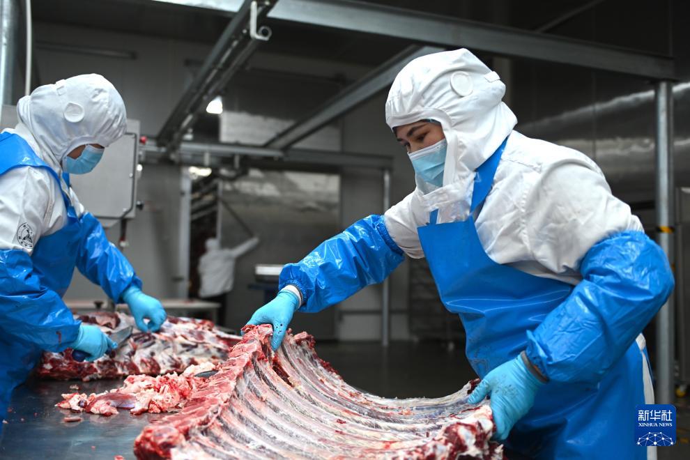 1月6日,工作人員在寧夏固原市涇源縣源牛農(nóng)牧科技有限公司生產(chǎn)車間加工黃牛肉。