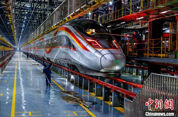 圖為修理庫(kù)中,工作人員清洗動(dòng)車。 張暢 攝