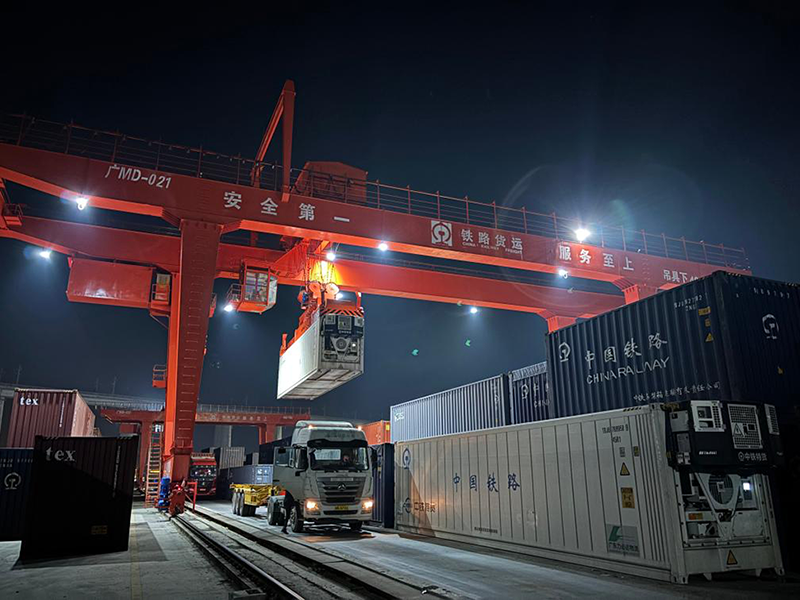 1月17日凌晨,在湖南懷化國際陸港,龍門吊正在將冷鏈集裝箱吊裝到卡車上。新華社記者余春生 攝