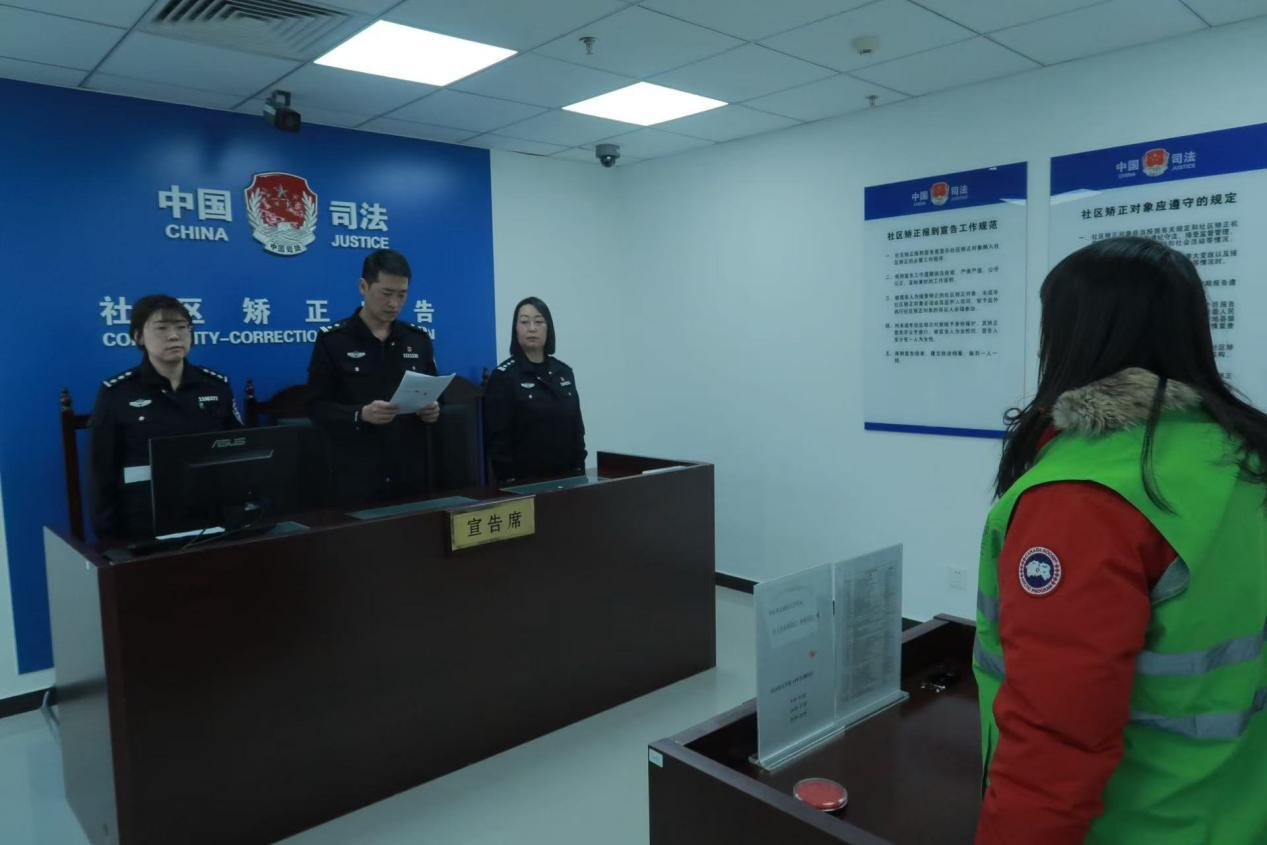比起心理咨詢室里的溫情,在另外一間“宣告室”內(nèi),氣氛則明顯莊嚴。中午十二點十分,選派監(jiān)獄(戒毒)警察參與社區(qū)矯正工作的趙奎向入矯對象嚴肅地宣讀相關(guān)規(guī)定:“在社區(qū)矯正期間應(yīng)當(dāng)遵守法律法規(guī),服從監(jiān)管,接受教育……”這是入矯對象在社區(qū)矯正中心的最后一個環(huán)節(jié)。