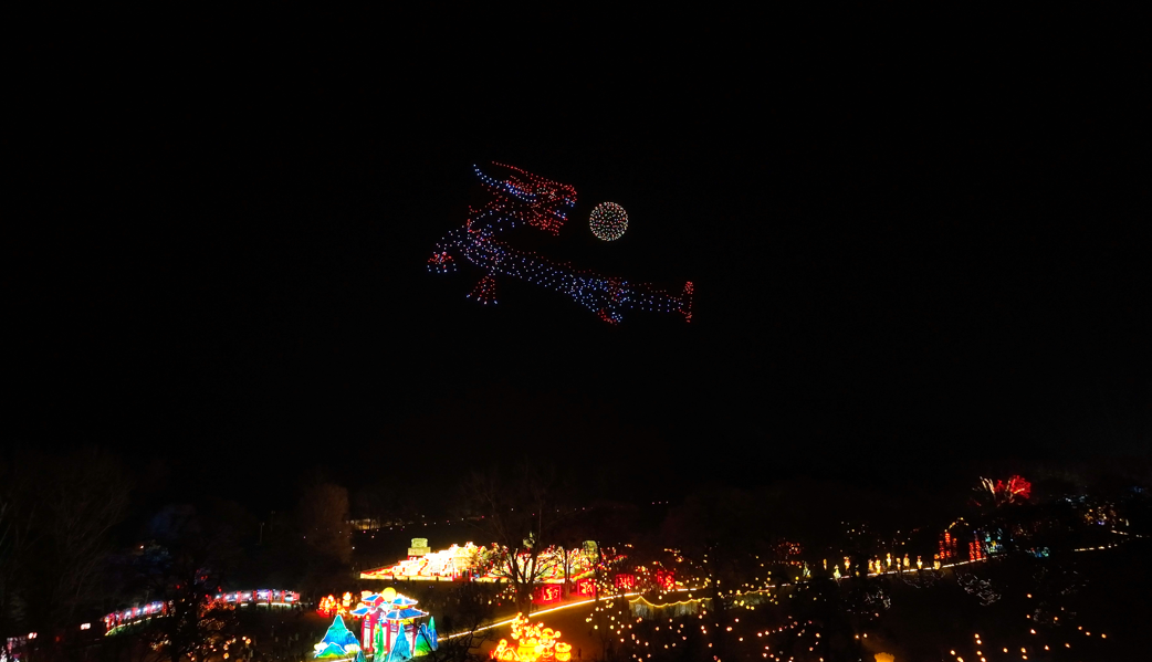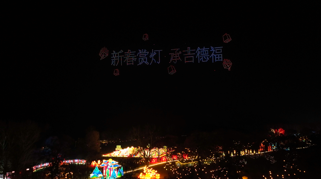 隨著夜色漸深,避暑山莊內(nèi)的氣氛也達(dá)到了高潮。1000架無人機(jī)緩緩升空,它們在天空中排列成各種圖案,從象征吉祥如意的傳統(tǒng)圖案到展現(xiàn)承德自然風(fēng)光的標(biāo)志性建筑,無不令人贊嘆。觀眾紛紛舉起手機(jī),記錄下這一震撼人心的瞬間。其中,“新春賞燈,承吉德?!钡淖謽佑绕湟俗⒛?,它不僅是對新年的美好祝愿,更是對中國傳統(tǒng)文化的生動體現(xiàn)。