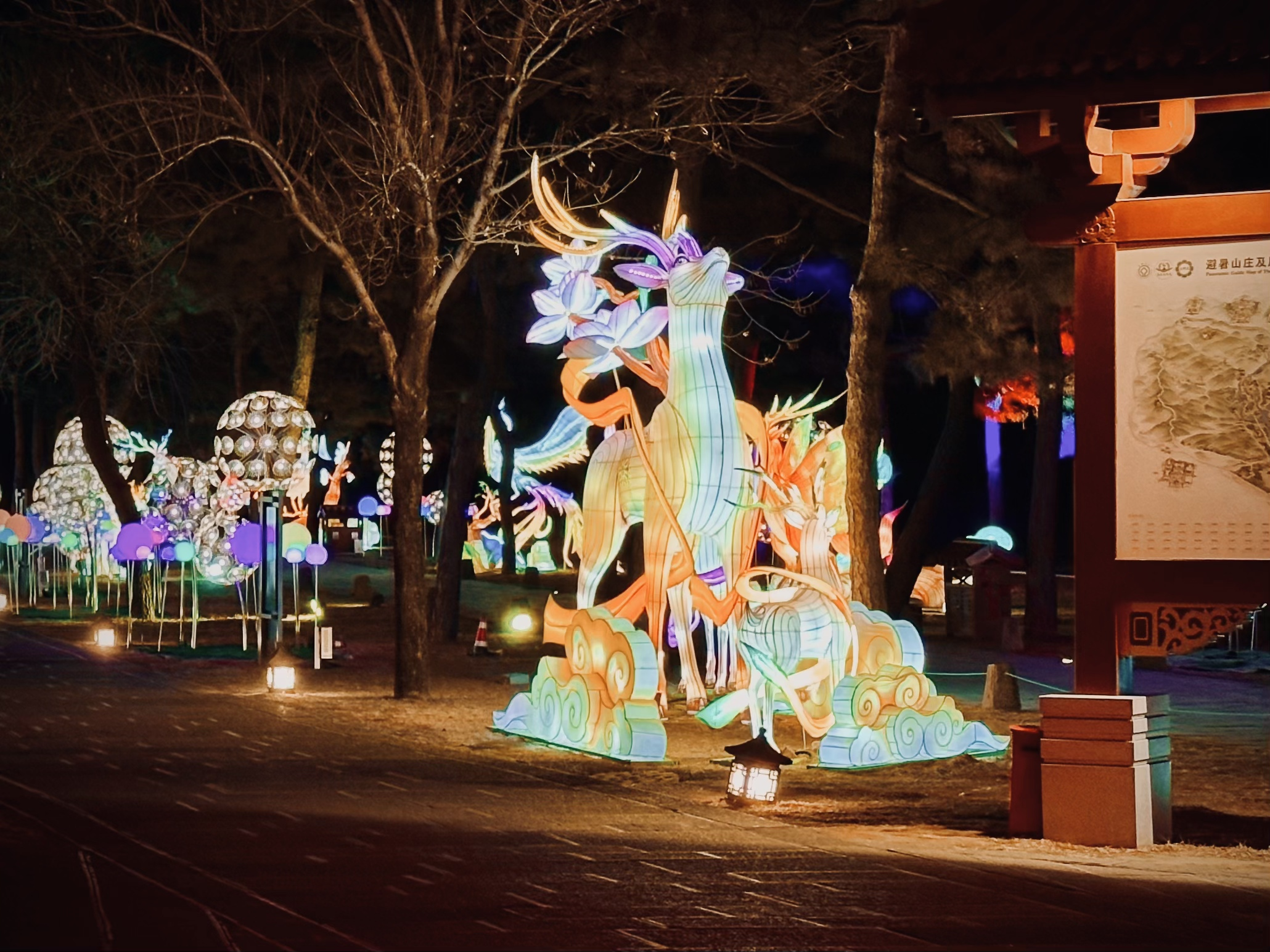在爭奇斗艷的各種燈組中,最引人注目的,當(dāng)屬位于萬樹園中央的“皇家印璽”燈組。它以四方印為母題,巨大的紅印章造型仿佛印刻在萬樹園的草地上。內(nèi)部設(shè)有四個入口,游客可以穿梭其中,感受起伏山巒的設(shè)計理念。立面上展示了山莊內(nèi)康乾七十二景相關(guān)的詩詞,每處景觀都有詳細(xì)的注釋,使游客在欣賞美景的同時,也能深入了解山莊的歷史文化。