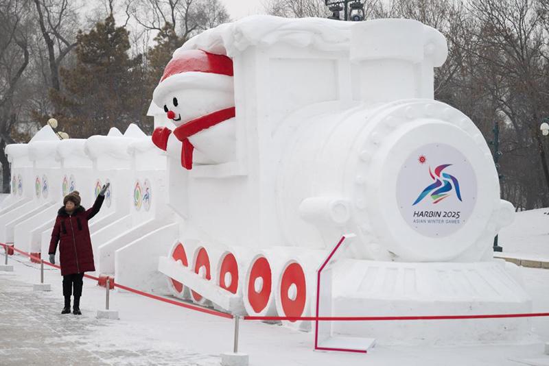 1月7日,在哈爾濱太陽(yáng)島雪博會(huì)園區(qū),游客與“亞冬列車”雪雕合影。新華社記者 張濤 攝