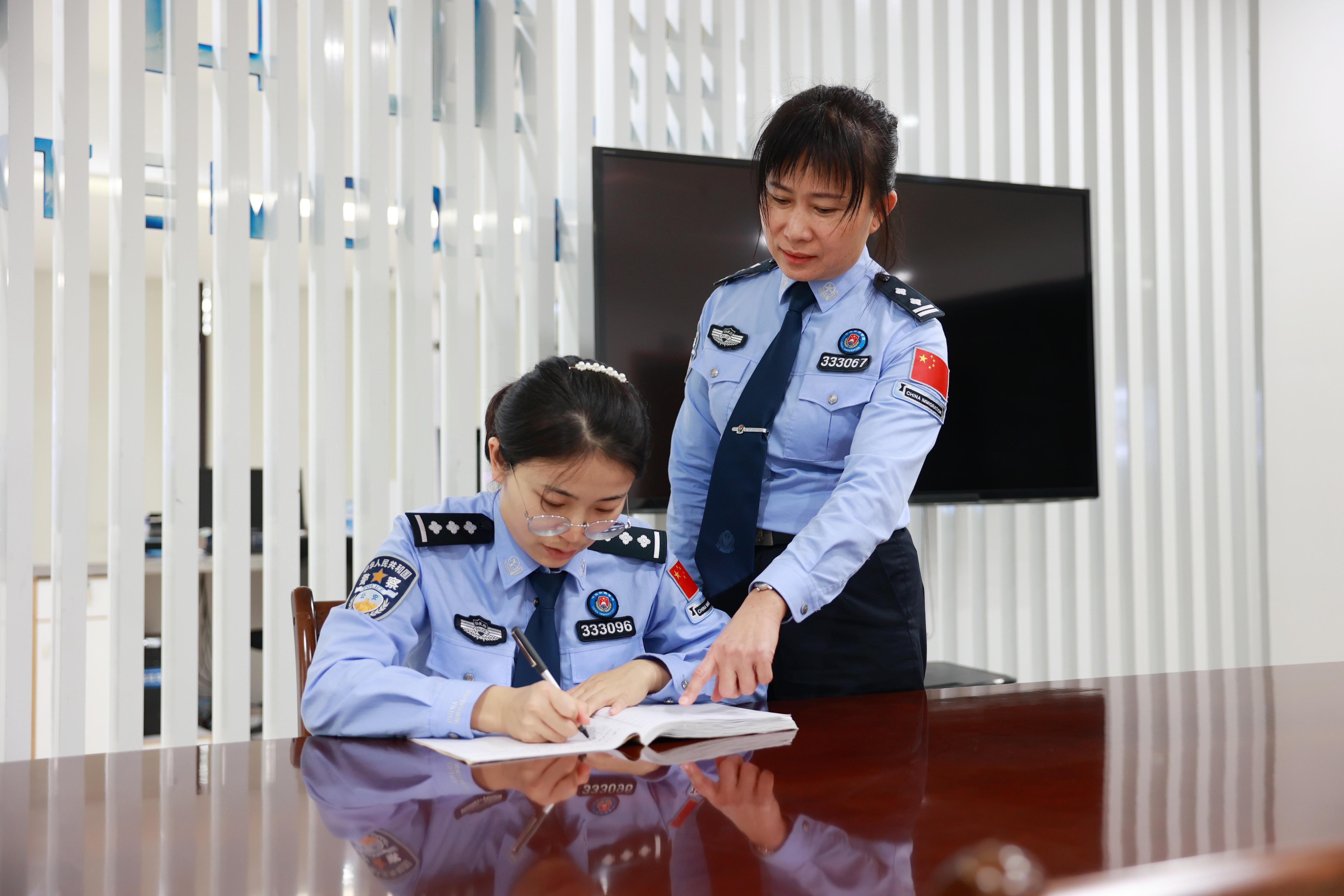 圖為三亞邊檢站執(zhí)勤一隊(duì)民警符免納春節(jié)期間堅(jiān)守在口岸執(zhí)勤一線幫扶新民警。