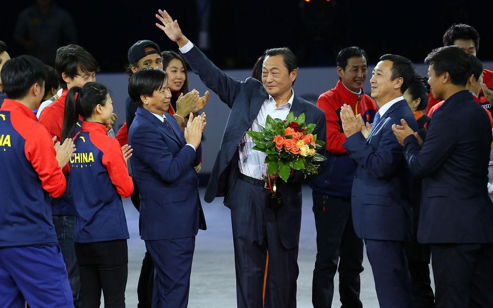 資料圖:中國(guó)花樣滑冰隊(duì)總教練姚濱(中)在頒獎(jiǎng)儀式上向觀眾揮手致意。當(dāng)日,2015奧迪中國(guó)杯花滑大獎(jiǎng)賽在北京首都體育館落幕。在比賽后,姚濱獲頒終身成就獎(jiǎng)。新華社記者 曹燦 攝