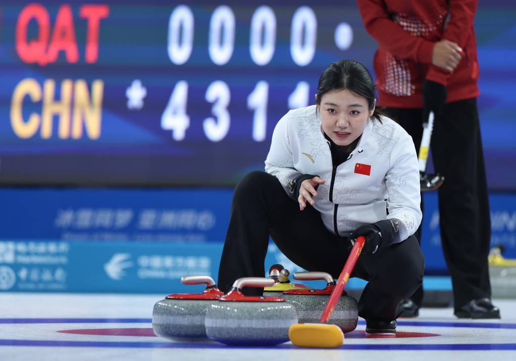 2月6日,中國隊(duì)選手韓雨在比賽中。當(dāng)日,在哈爾濱舉行的第九屆亞冬會(huì)冰壺混雙循環(huán)賽B組第8輪比賽中,中國隊(duì)10比1戰(zhàn)勝卡塔爾隊(duì)。新華社記者 王楷焱 攝