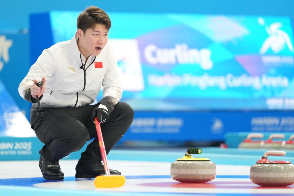 2月6日,中國隊(duì)選手王智宇在比賽中指揮隊(duì)友擦冰。當(dāng)日,在哈爾濱舉行的第九屆亞冬會(huì)冰壺混雙循環(huán)賽B組第6輪比賽中,中國隊(duì)6比4戰(zhàn)勝韓國隊(duì)。新華社記者 王松 攝