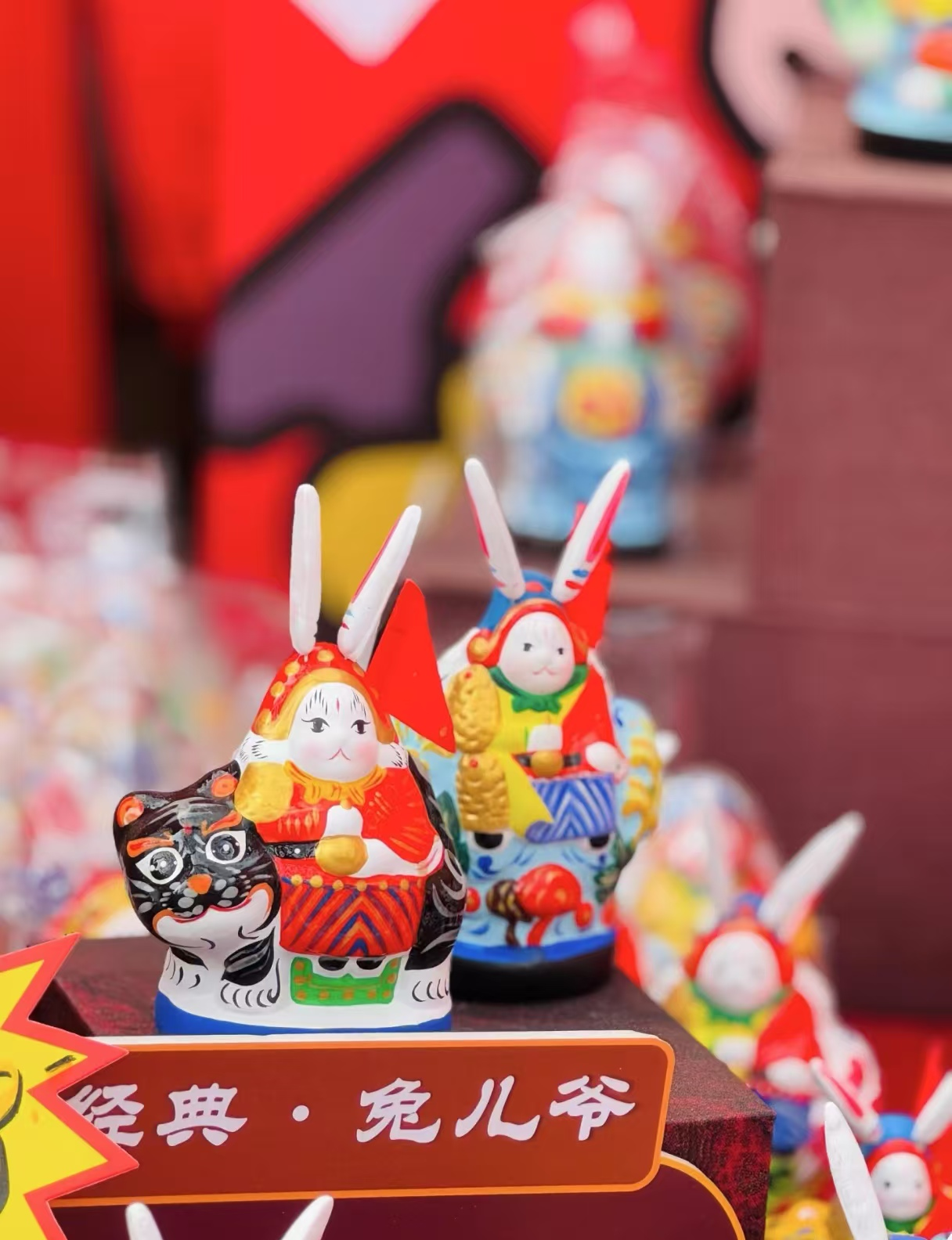 店鋪里擺滿了各式各樣的兔兒爺,濃濃的氛圍感撲面而來,每一個(gè)兔兒爺?shù)纳?、形態(tài)各異,特別有趣。據(jù)店鋪老板介紹,關(guān)于兔兒爺,傳說是嫦娥身邊的搗藥小兔子,所以他也寓意著祛病消災(zāi),保佑人們健康平安。