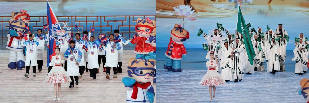 2月7日,第九屆亞洲冬季運(yùn)動(dòng)會(huì)開幕式在哈爾濱舉行。圖為柬埔寨體育代表團(tuán)(左)和沙特阿拉伯體育代表團(tuán)在開幕式上入場(chǎng)。新華社記者 楊磊 攝