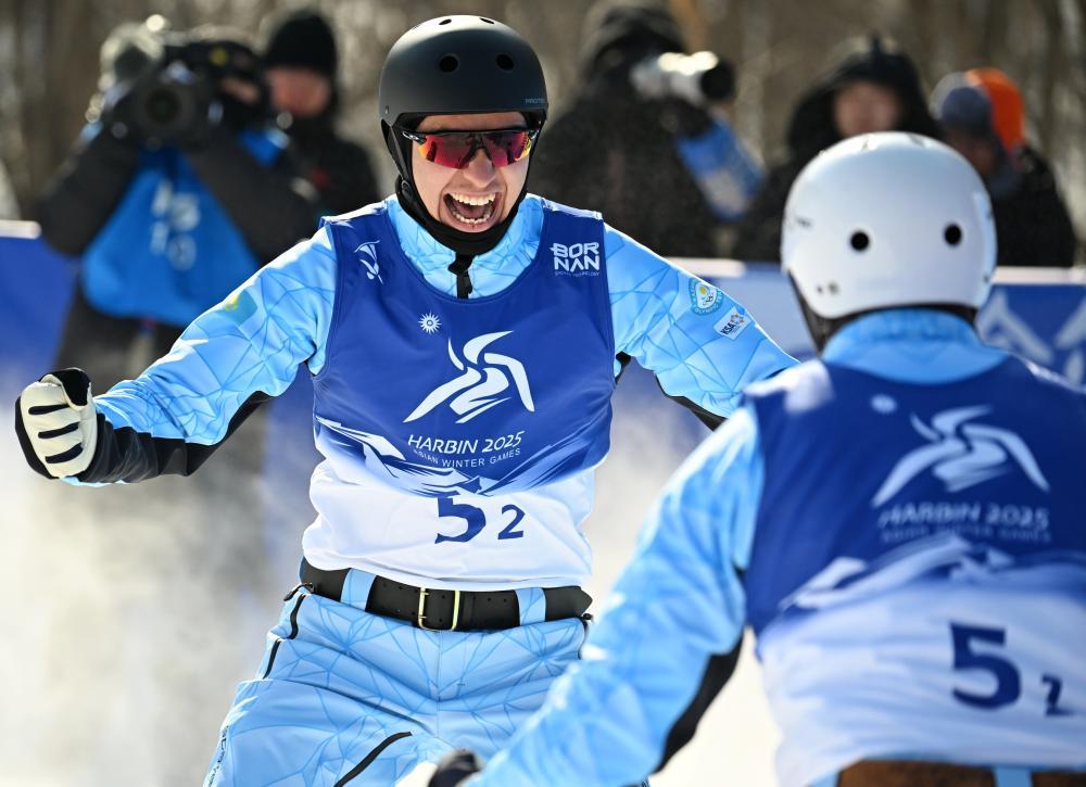 2月11日,哈薩克斯坦選手謝爾佐德·卡希爾巴耶夫(左)與羅曼·伊萬諾夫慶祝。最終,他們獲得冠軍。當(dāng)日,第九屆亞冬會(huì)自由式滑雪男子空中技巧雙人同步?jīng)Q賽在亞布力舉行。新華社記者 張晨霖 攝
