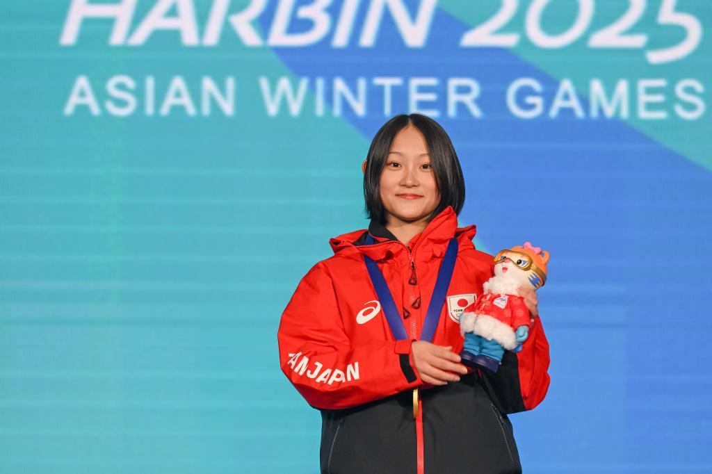 2月13日,日本選手清水笑良在頒獎(jiǎng)儀式上。當(dāng)日,第九屆亞冬會(huì)單板滑雪女子U型場(chǎng)地技巧比賽決賽因大風(fēng)天氣取消,最終按照預(yù)賽成績(jī)決定獎(jiǎng)牌歸屬。新華社記者 連振 攝