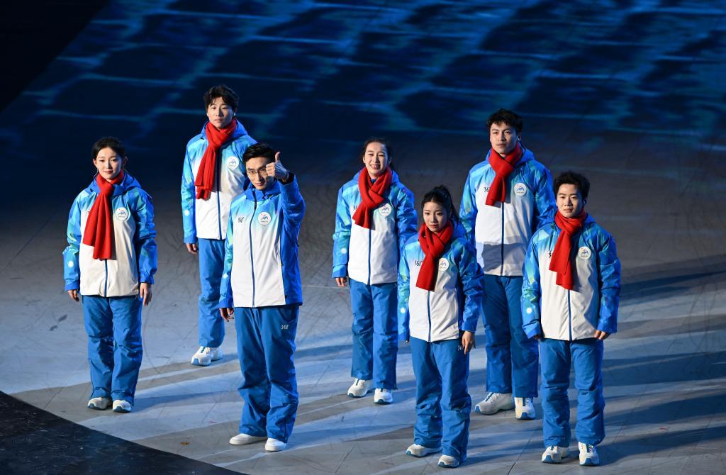 2月14日,志愿者代表們?cè)陂]幕式上。新華社記者 黃博涵 攝