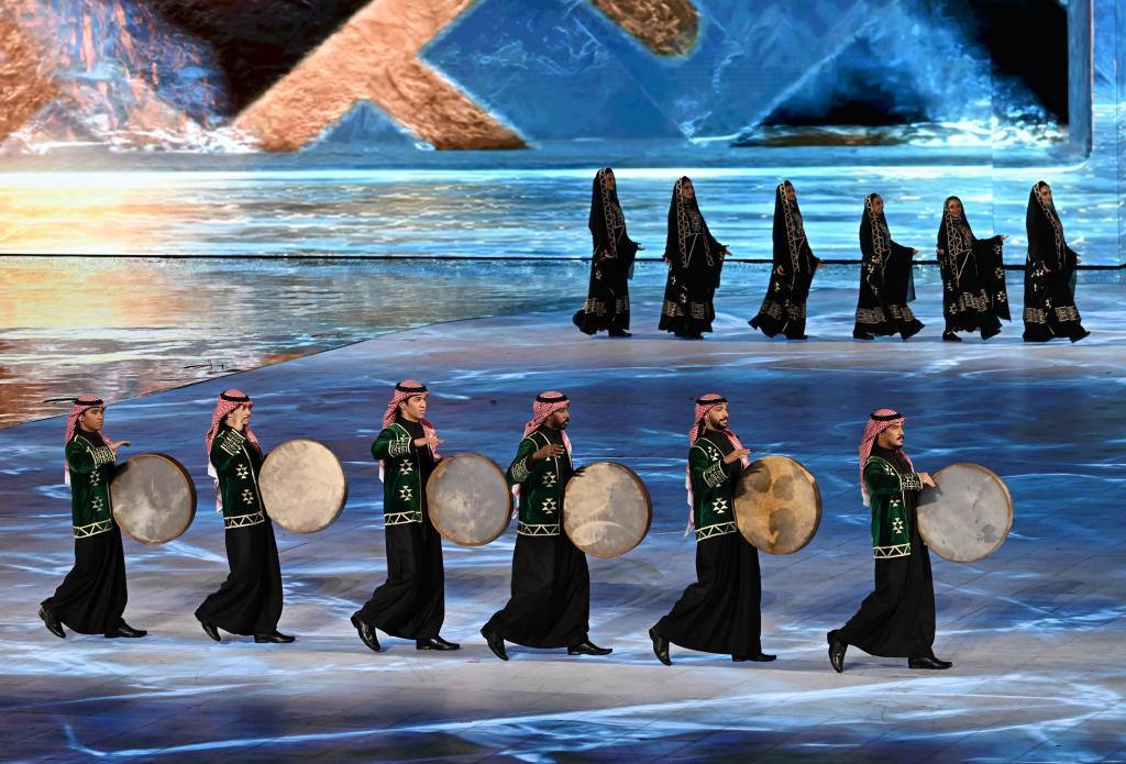 作為下一屆亞冬會(huì)舉辦城市,來(lái)自沙特阿拉伯未來(lái)新城的文藝表演舞姿曼妙,鼓點(diǎn)歡快,洋溢著濃郁的西亞風(fēng)情。頃刻間,整個(gè)舞臺(tái)化作冰雪運(yùn)動(dòng)場(chǎng),光影穿梭的運(yùn)動(dòng)員號(hào)召著下一次相約,在現(xiàn)場(chǎng)掀起新的高潮。