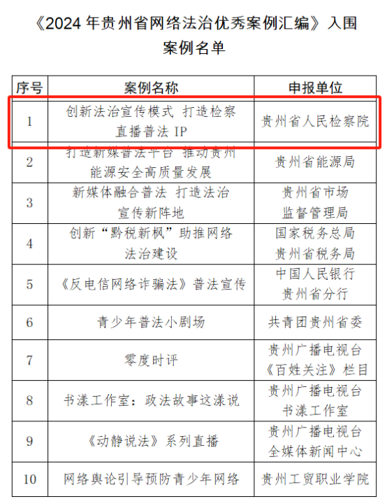 由貴州省委網(wǎng)信辦主辦的2024年貴州省網(wǎng)絡法治優(yōu)秀案例征集活動結(jié)果日前揭曉,貴州省人民檢察院的《創(chuàng)新法治宣傳模式 打造檢察直播普法IP》普法宣傳案例成功入選。