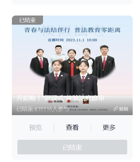 貴州省人民檢察院傾力打造“我是檢察官·直播間”原創(chuàng)普法IP,聯(lián)合黨政機關、學校等開展普法活動,打造“檢察官+”普法宣傳模式,通過模擬法庭、專家講解、互動答疑等形式,將司法實踐與線上直播結(jié)合,讓法律知識“活”起來,群眾可以沉浸式體驗“司法活動”和“檢察辦案”等。