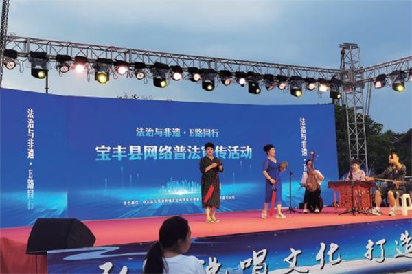 充分利用馬街書會活動規(guī)模大、人流量大的特點(diǎn),將“法治與非遺 E路同行”網(wǎng)絡(luò)普法宣傳活動舉辦地安排在馬街中華曲藝展覽館,精心設(shè)置舞臺展演、展板宣傳、現(xiàn)場互動等活動內(nèi)容,還通過寶豐生活網(wǎng)、直播鷹城等新媒體賬號進(jìn)行直播,打造“有節(jié)目、有場地、時(shí)時(shí)有、隨時(shí)看”的網(wǎng)絡(luò)普法宣傳“寶豐品牌”。(馬街書會作為中國最大的民間曲藝大會,被譽(yù)為“中國十大民俗”之一,是全縣最具代表性的文化空間,群眾基礎(chǔ)廣泛。)