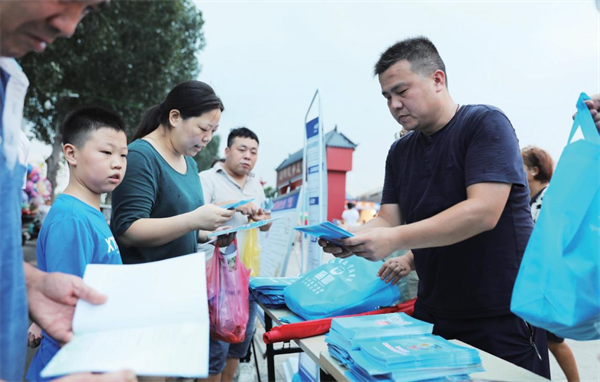 普法活動現(xiàn)場,工作人員向群眾發(fā)放宣傳手冊