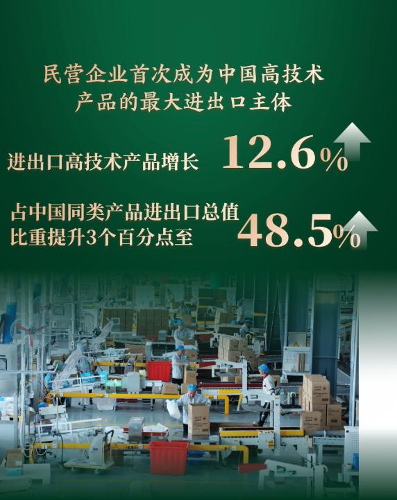民營企業(yè)首次成為中國高技術(shù)產(chǎn)品的最大進(jìn)出口主體,進(jìn)出口高技術(shù)產(chǎn)品增長12.6%,占中國同類產(chǎn)品進(jìn)出口總值比重提升3個百分點至48.5%。
