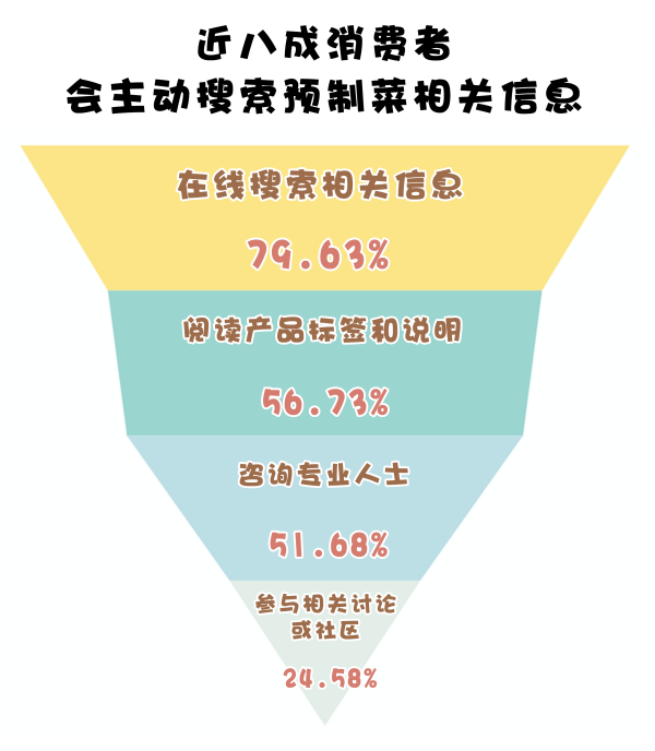 預(yù)制菜食品安全問(wèn)題令受消費(fèi)者尤為關(guān)注。從艾媒咨詢(xún)發(fā)布的數(shù)據(jù)來(lái)看,近八成的消費(fèi)者會(huì)主動(dòng)搜索預(yù)制菜相關(guān)信息,超過(guò)五成的消費(fèi)者會(huì)通過(guò)閱讀產(chǎn)品標(biāo)簽和說(shuō)明、咨詢(xún)專(zhuān)業(yè)人士來(lái)確保自己吃到的是安全健康的預(yù)制菜。