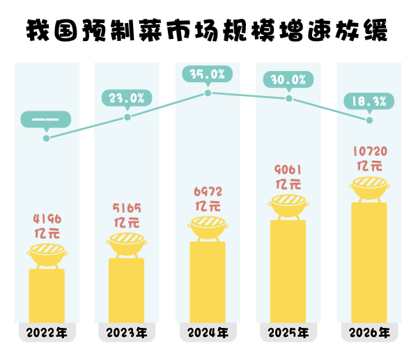 從艾媒咨詢(xún)發(fā)布的數(shù)據(jù)來(lái)看,我國(guó)預(yù)制菜市場(chǎng)規(guī)模呈逐年擴(kuò)張趨勢(shì),并有望在2026年突破10720億元,但是預(yù)制菜市場(chǎng)規(guī)模增速卻在逐步放緩。2024年,我國(guó)預(yù)制菜市場(chǎng)規(guī)模同比增長(zhǎng)率為35%,而這一數(shù)字預(yù)計(jì)在2026年跌至18.3%。