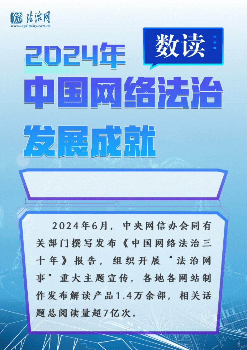 4月27日,國家互聯(lián)網(wǎng)信息辦公室發(fā)布《中國網(wǎng)絡(luò)法治發(fā)展報(bào)告(2024年)》。這是首部國家部門層面發(fā)布的網(wǎng)絡(luò)法治綜合性年度報(bào)告,既是《中國網(wǎng)絡(luò)法治三十年》報(bào)告的續(xù)篇,也是中國網(wǎng)絡(luò)法治發(fā)展年度報(bào)告的開篇。讓我們用一組數(shù)據(jù)帶你看我國網(wǎng)絡(luò)法治建設(shè)這一年的成就,感受網(wǎng)絡(luò)法治建設(shè)邁出的堅(jiān)實(shí)步伐。