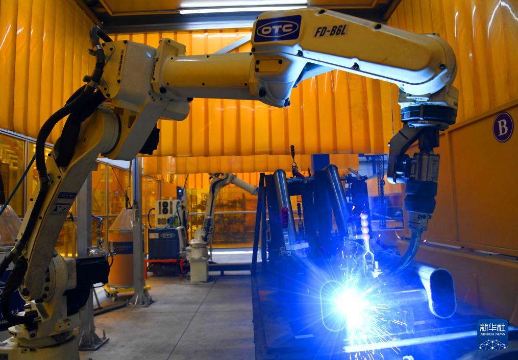 青島英派斯健康科技股份有限公司智慧工廠內(nèi)的自動(dòng)激光焊接機(jī)器人在作業(yè)(4月22日攝)。