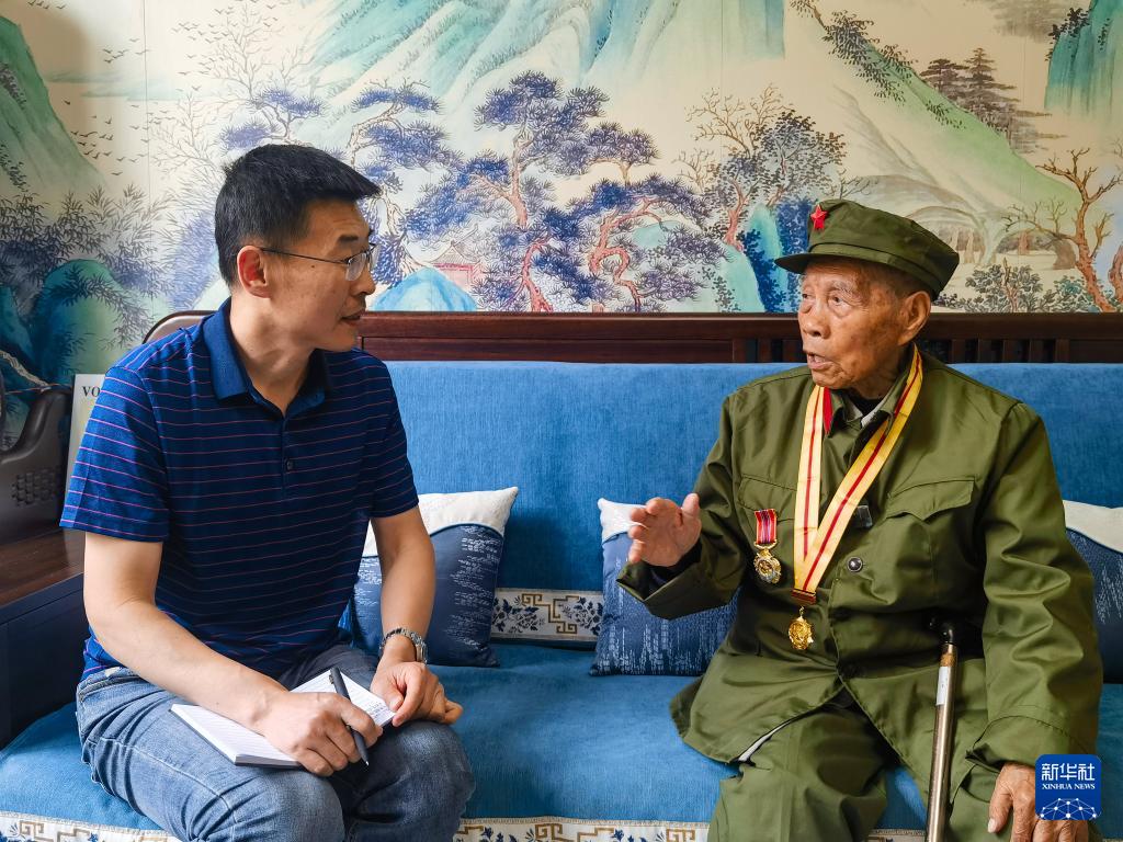 5月27日,百歲抗戰(zhàn)老兵崔良奎在陜西省渭南市的家中接受新華社記者采訪。新華社發(fā)(楊健 攝)